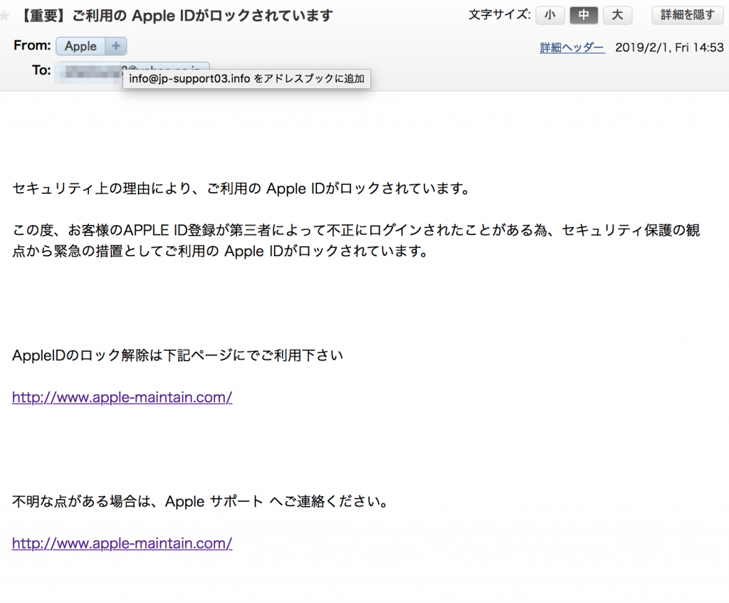 Appleからのメールではないことがわかります。(Appleの場合には**@***.apple.com」のようにapple.comがメールの最後についています)