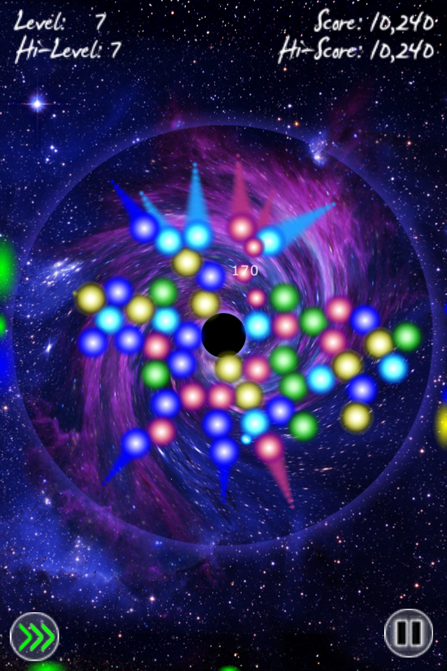 ブラックホールにのみこまれないようにボールをスペースへ投げて行くゲーム。