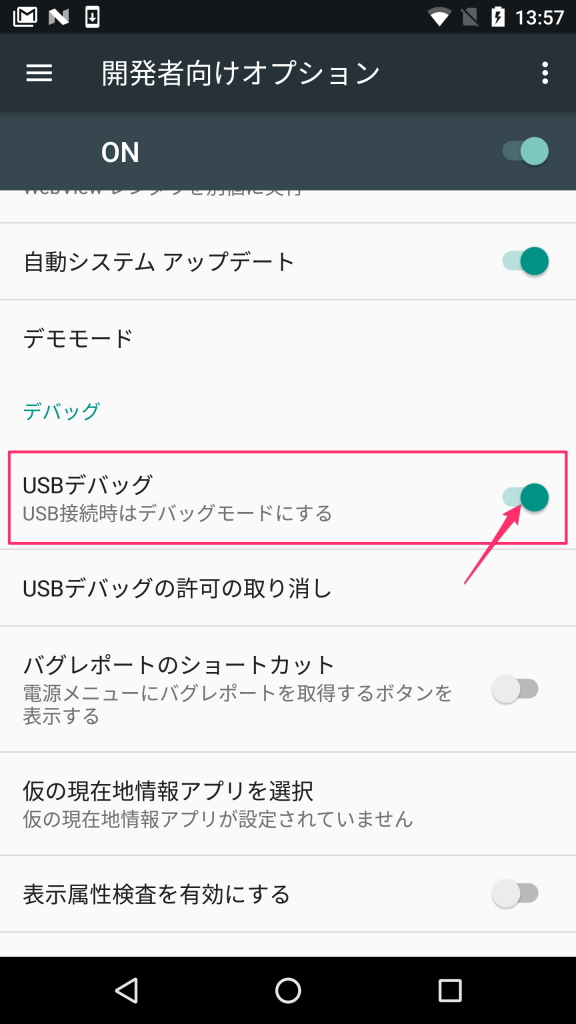 Android端末の「設定>開発者向けオプション」を開きます。