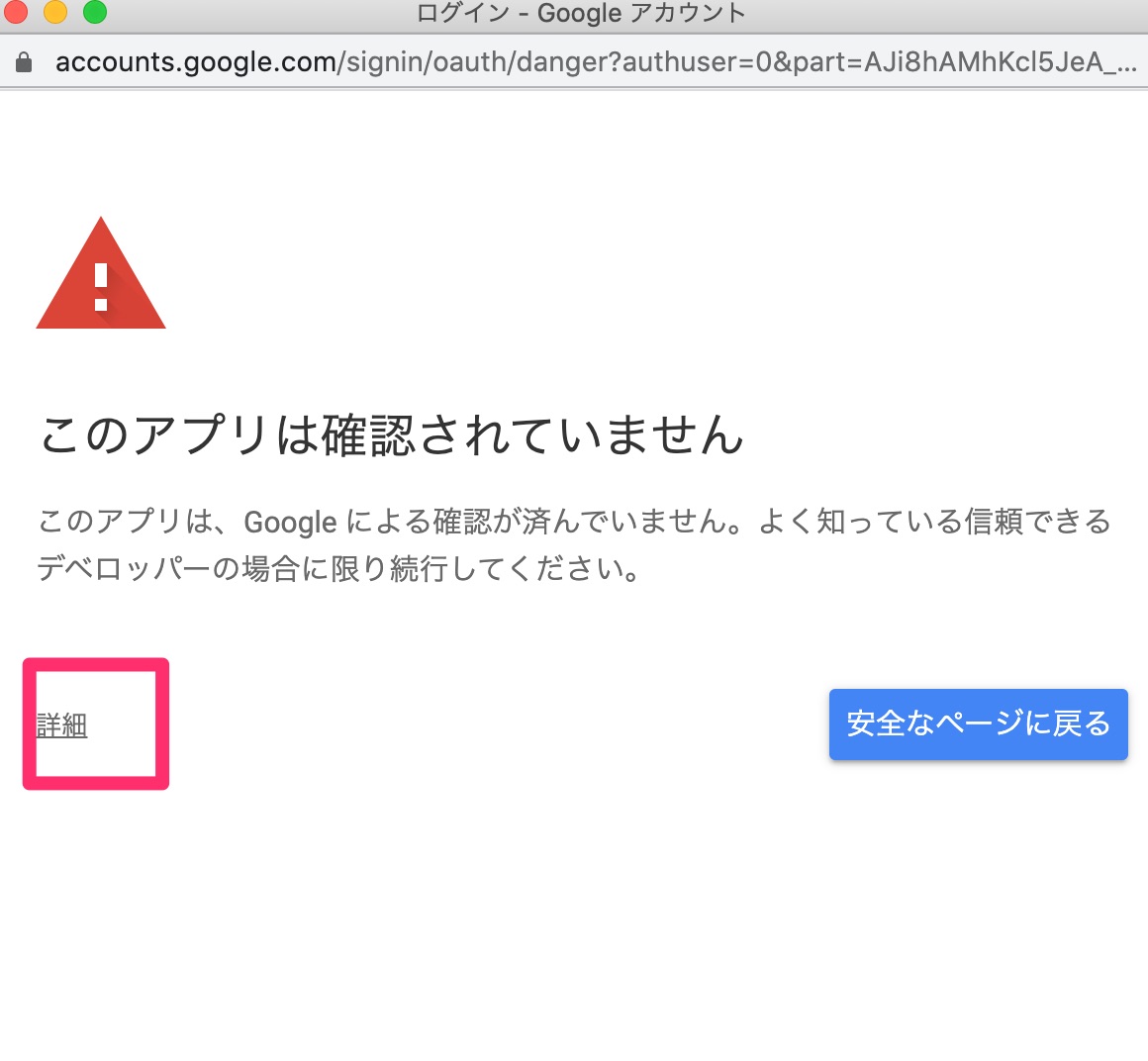 このアプリは確認されていませんの表示がでたら「詳細」を押します。
