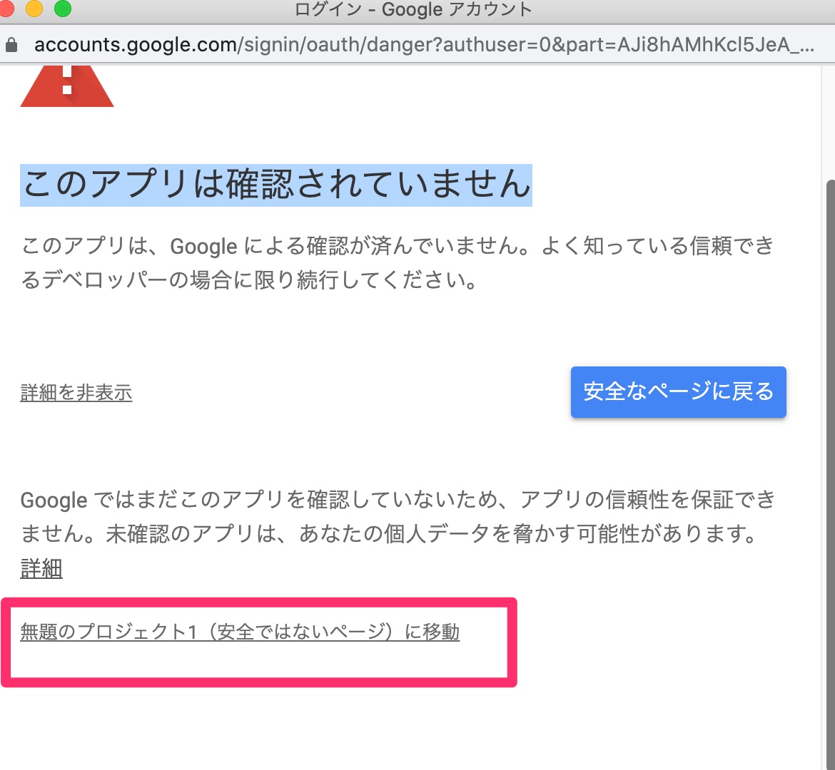 隠れている部分が表示されるので「ブロジェクト名に移動(安全ではないページ)」を押します。