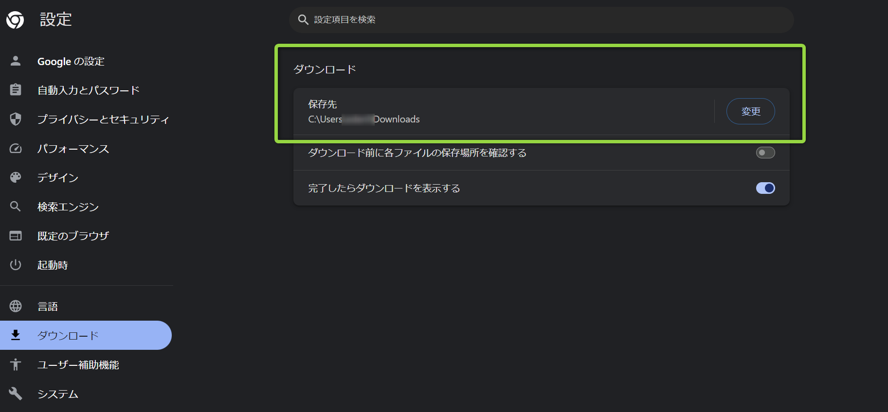 ダウンロードの「保存先」を変更したいフォルダに指定します。