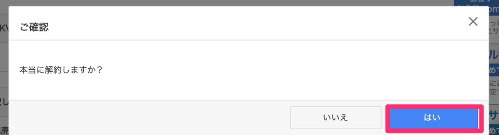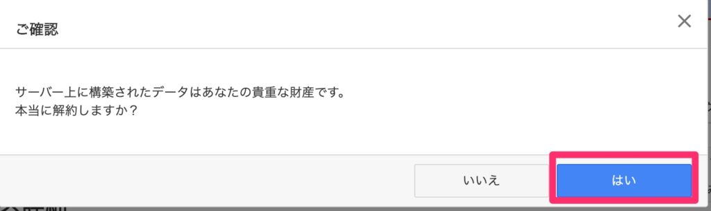 確認文「サーバー上に構築されたデータはあなたの貴重な財産です。本当に解約しますか?」が出るので「はい」を選択。