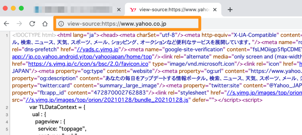 もしyahoo.co.jpのhtmlソースを表示したいと思った場合には、URLバーに『view-source:https://www.yahoo.co.jp/』を入れることでソースを見ることができます。