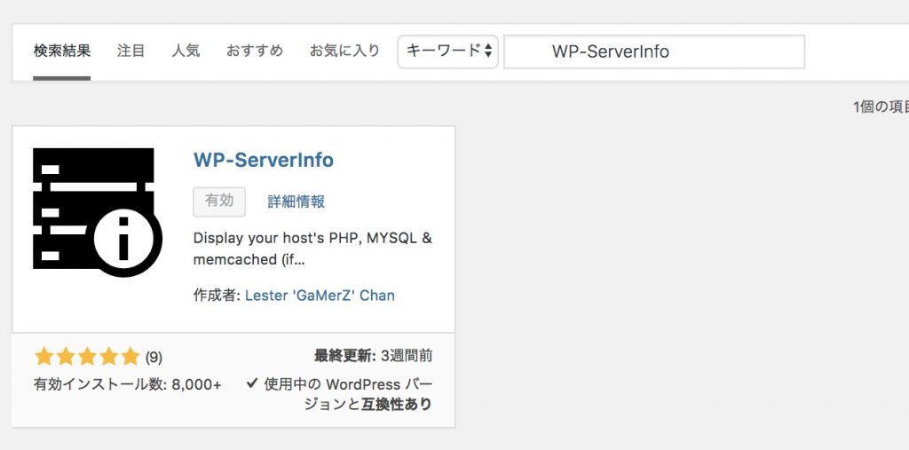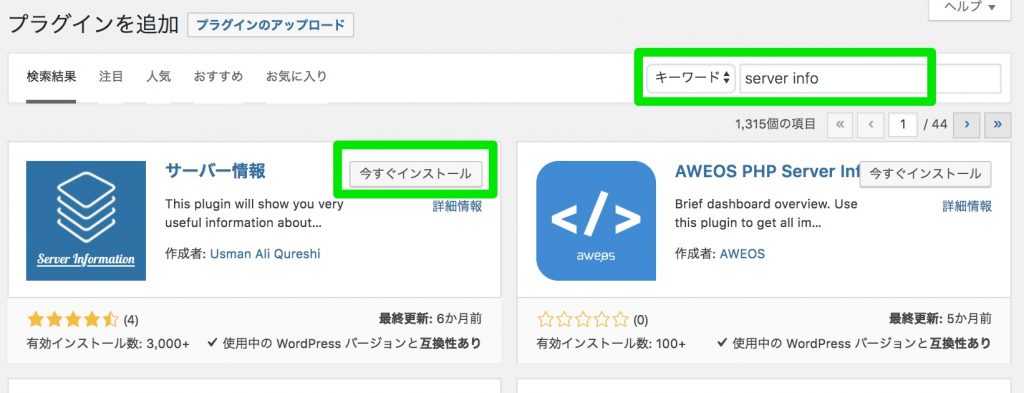 検索フォームに「server info」を入力して「サーバー情報」のプラグインをインストールして