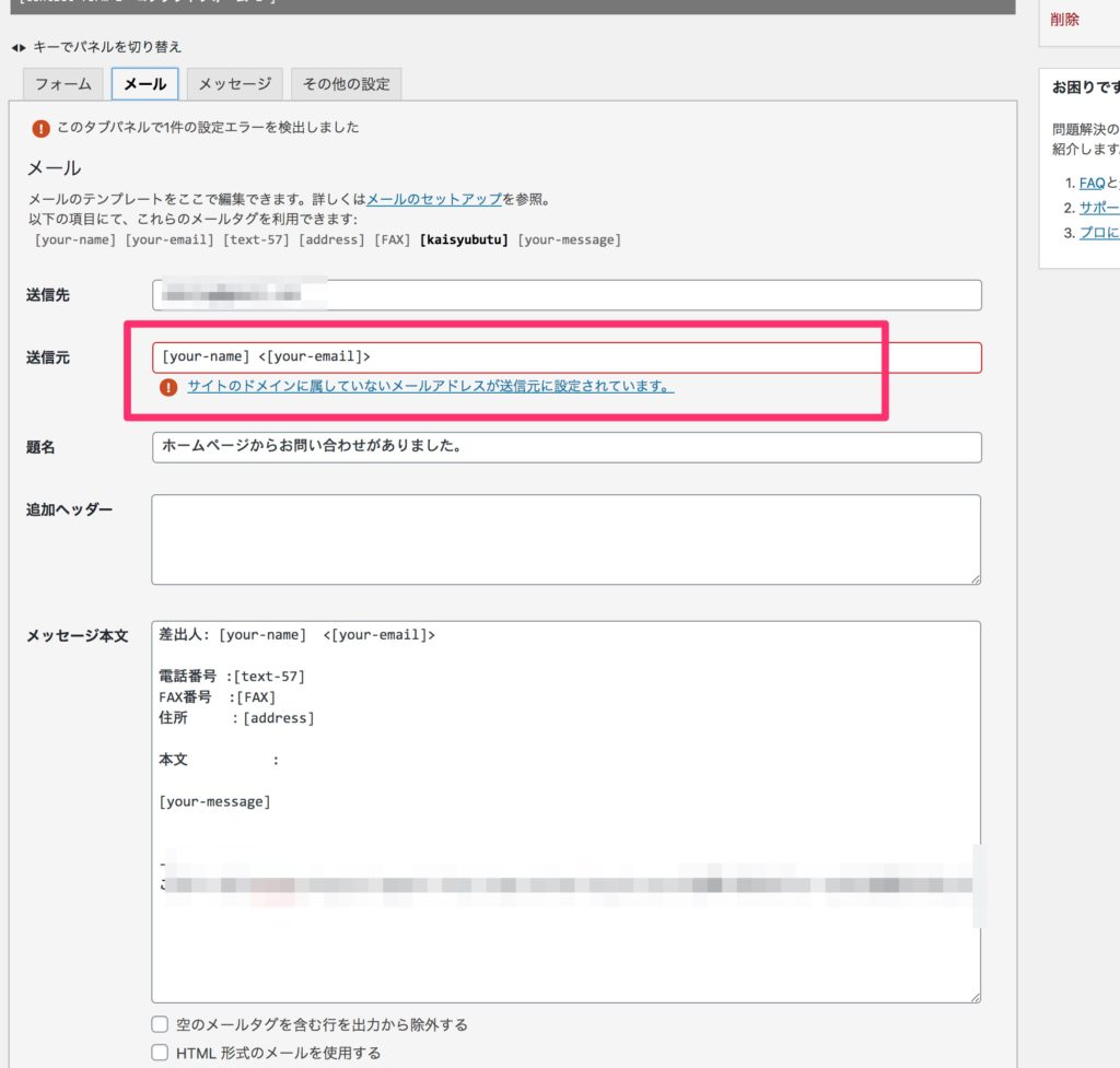 コンタクトフォームの編集ページにある「メール」タブにエラーが表示されていたため気がつきました。