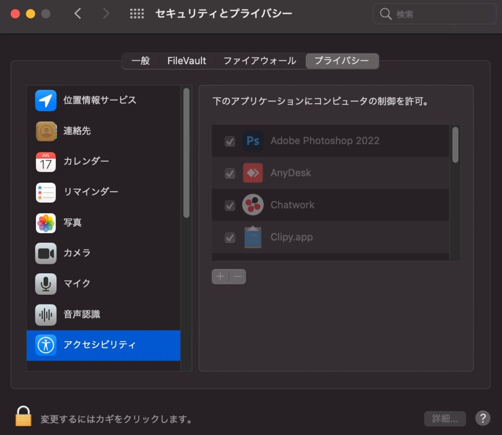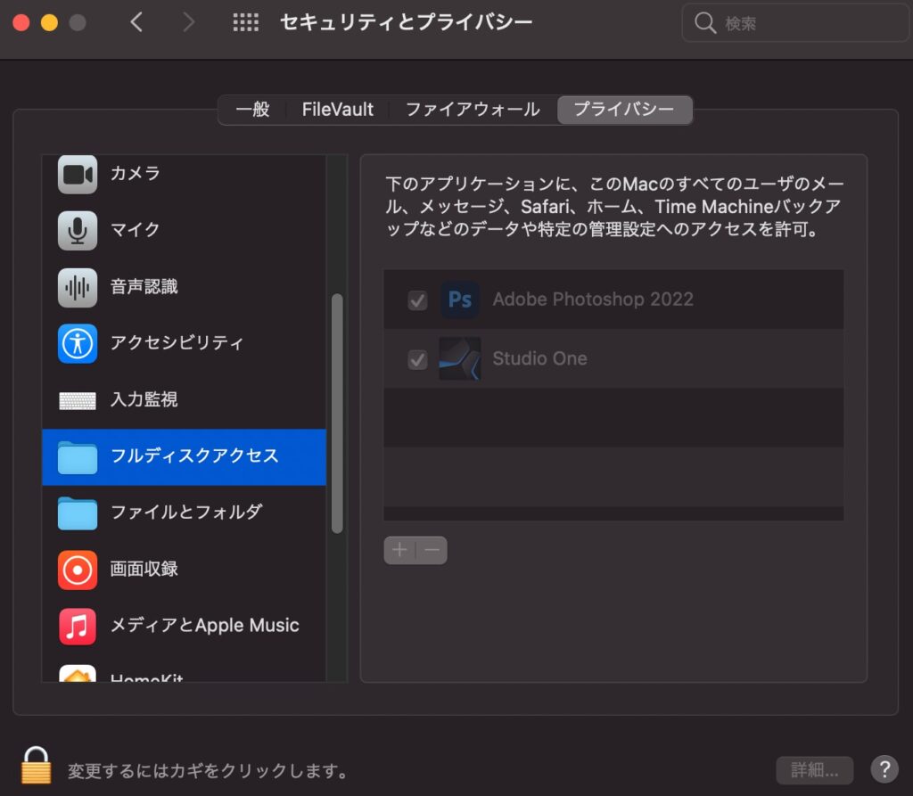 セキュリティとプライバシーを開いてPhotoshop2022に権限を追加