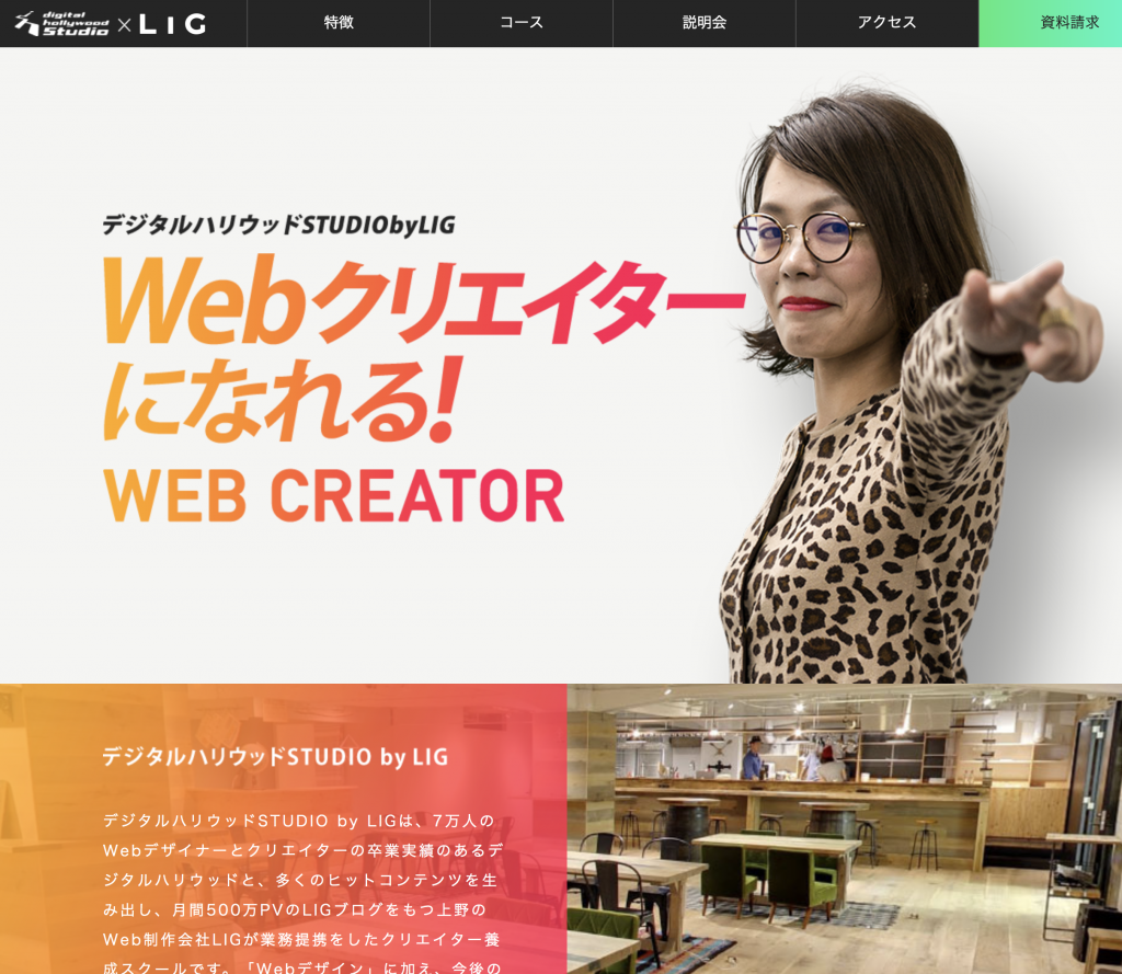 「デジタルハリウッド STUDIO by LIG」はWEBデザイナー、WEBプログラマー、ネット動画クリエイターなどWEBクリエイターを目指す人が学べるスクールですが、