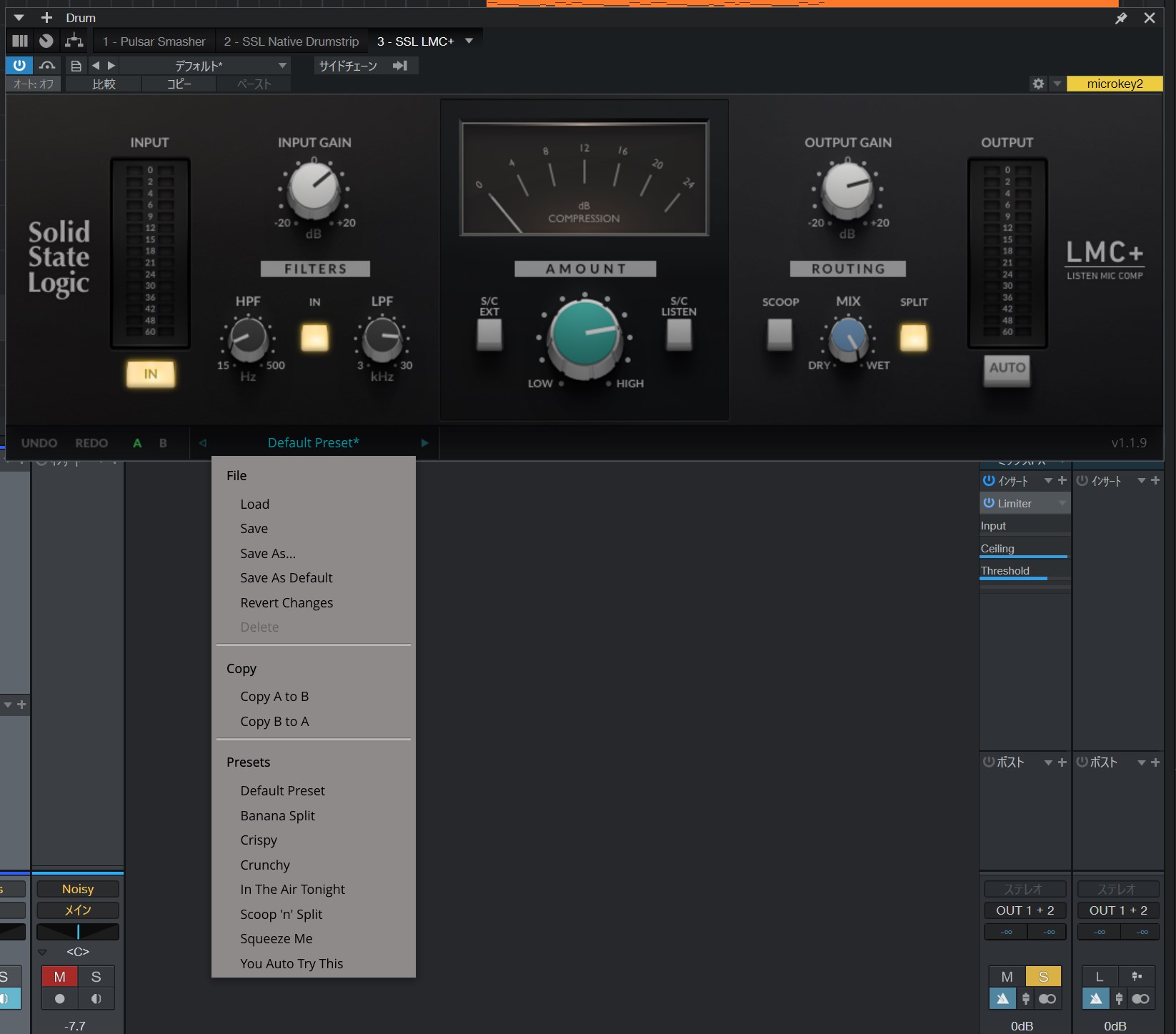 「SSL LMC+」の場合はリッスンマイクコンプレッサーの強いコンプを色々なトラックへ使ってみたいなら導入する価値があるプラグインです。