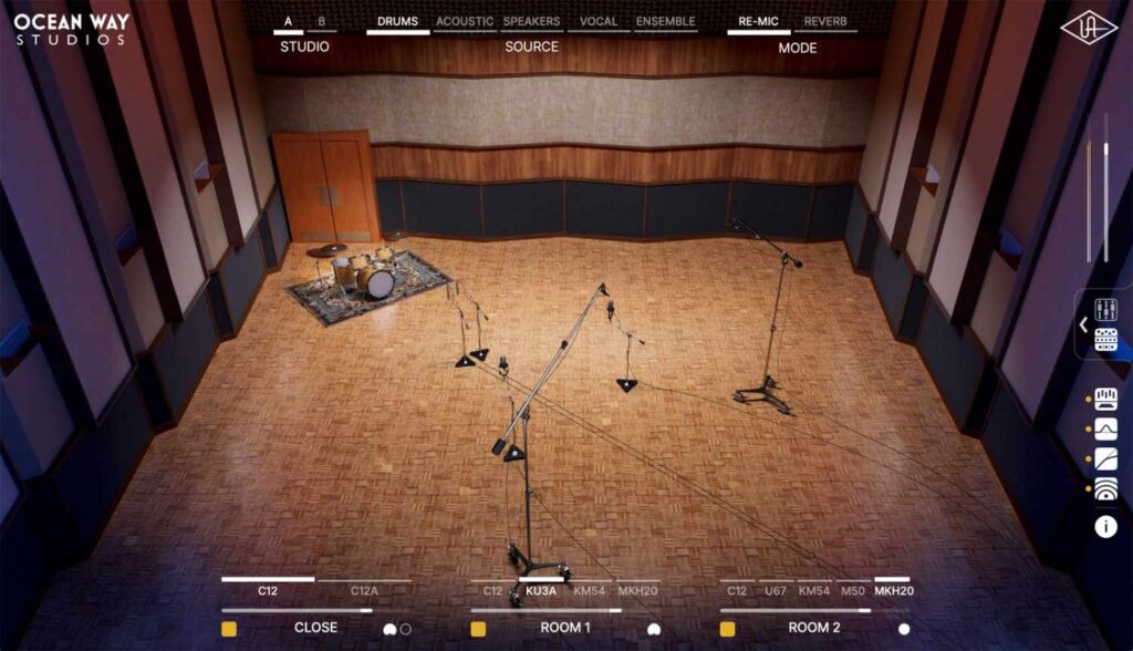 - Re-Mic (Microphone) Mode: これこそがこのプラグインの真骨頂です。入力されたオーディオソース(例えば、ライン録音されたギターや、打ち込みのドラム音源)を、**「Sound Cityのスタジオでアンプやスピーカーから鳴らし、それをマイクで録音し直した」**ような音に変換します。 原音(Direct)と部屋鳴り(Room)のバランスではなく、「マイクで拾った音そのもの」を出力するため、音の質感そのものが劇的に変化します。