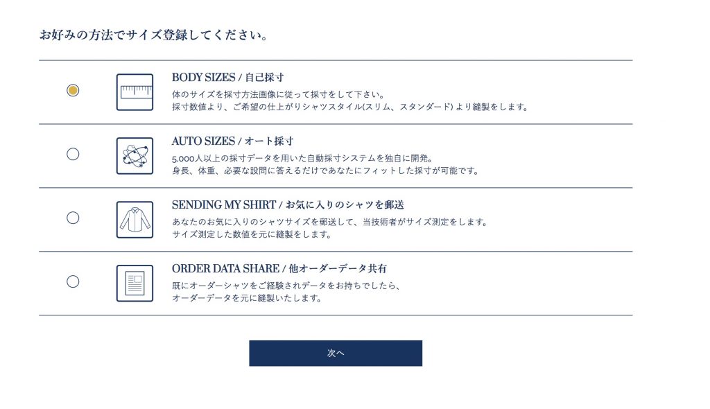 採寸は採寸数値を入力する自己採寸、オート採寸、お気に入りシャツを郵送、オーダーシャツデータから作ると