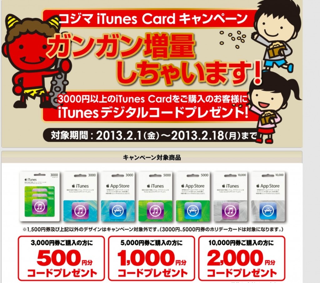 【iTunesカード】家電量販店コジマで2月18日まで増量キャンペーン