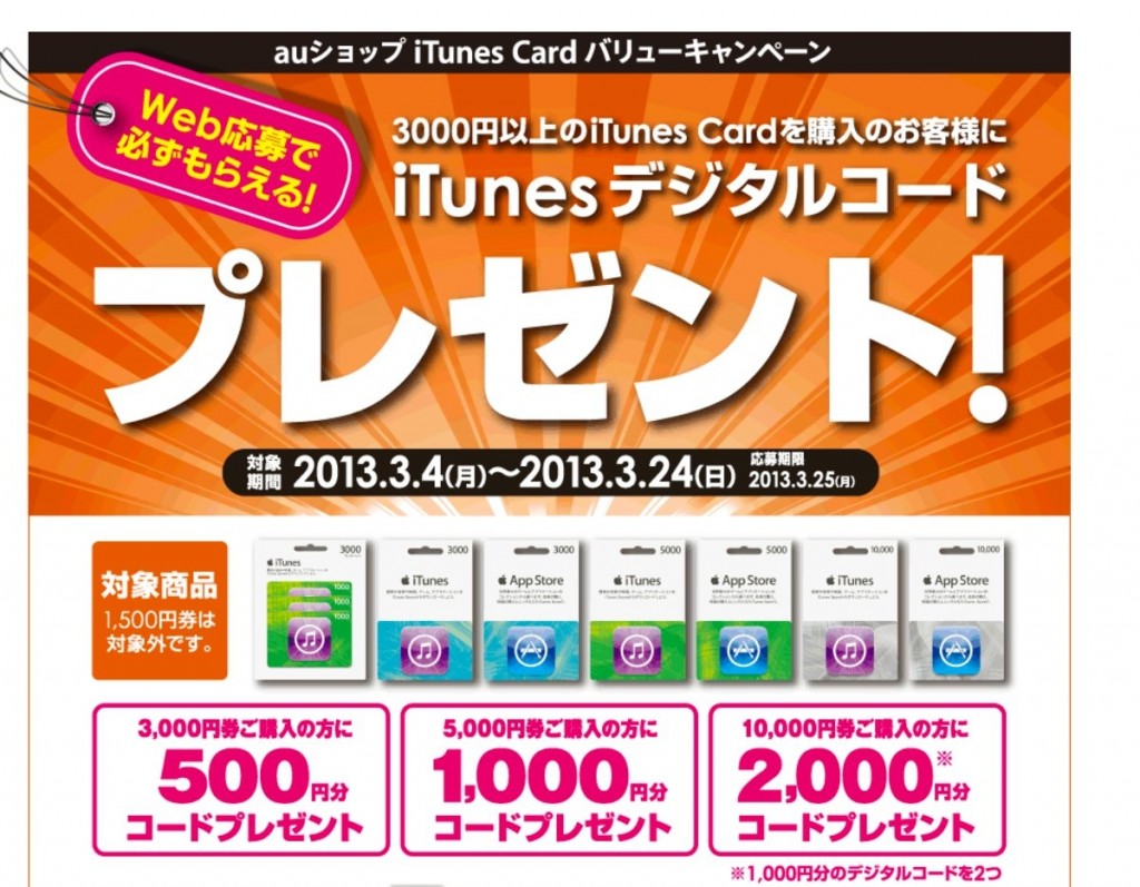 3月4日〜24日までauショップでiTunes Cardのキャンペーン中 -