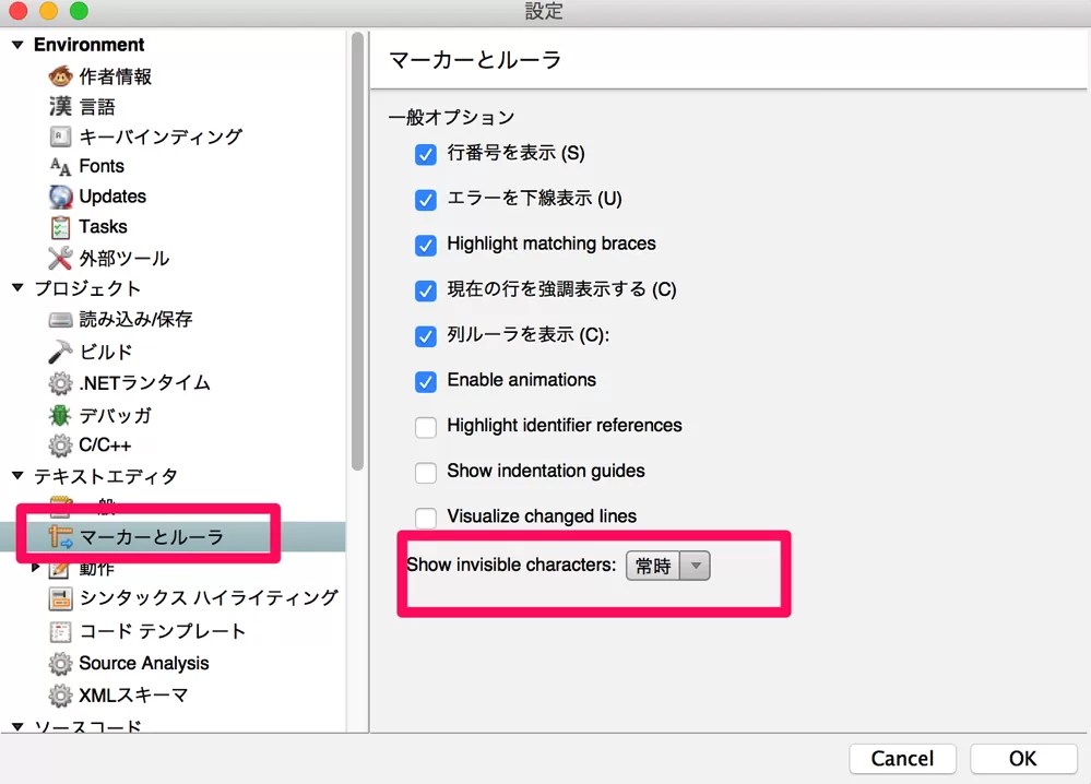 Show invisible charactersを「常時」に合わせてOKを選択。