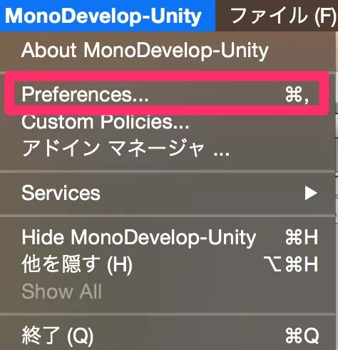 MonoDevelopを開きメニューから「Preferences」を選択。