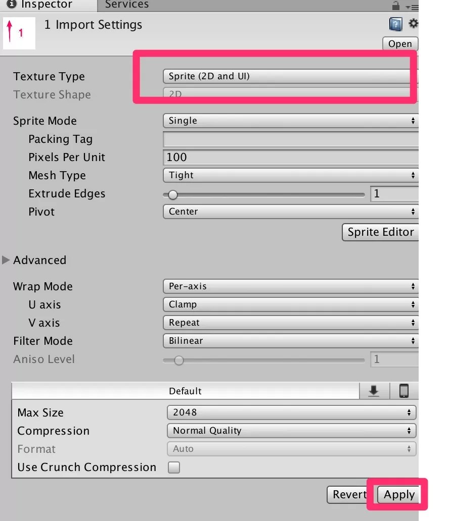 2つの画像ファイルを選択後、InspectorビューでTexture typeを『Sprite(2D and UI』に変えてApplyを押します。 - HierarchyへCanvasを作って、Imageを配置。