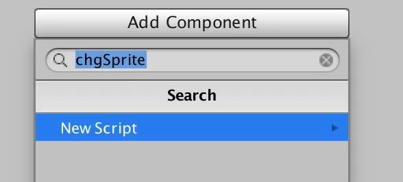 chgSpriteと入力して「NewScript」を押します。 - chgSprite.csをアタッチしたら、Scriptの名前欄をダブルクリックしてchgSprite.csを開きます。