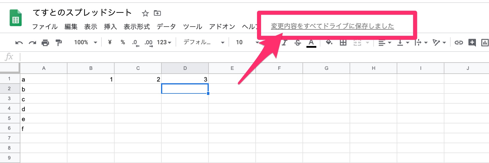 何かしらスプレッドシートに変更を加えたなら「変更内容をすべてドライブに保存しました」と表示されます。