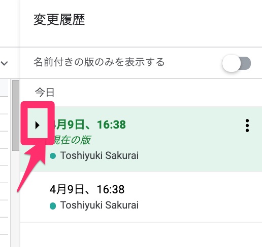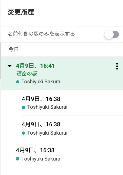 変更履歴を見るとスプレッドシートを自動保存した時間が表示されています。