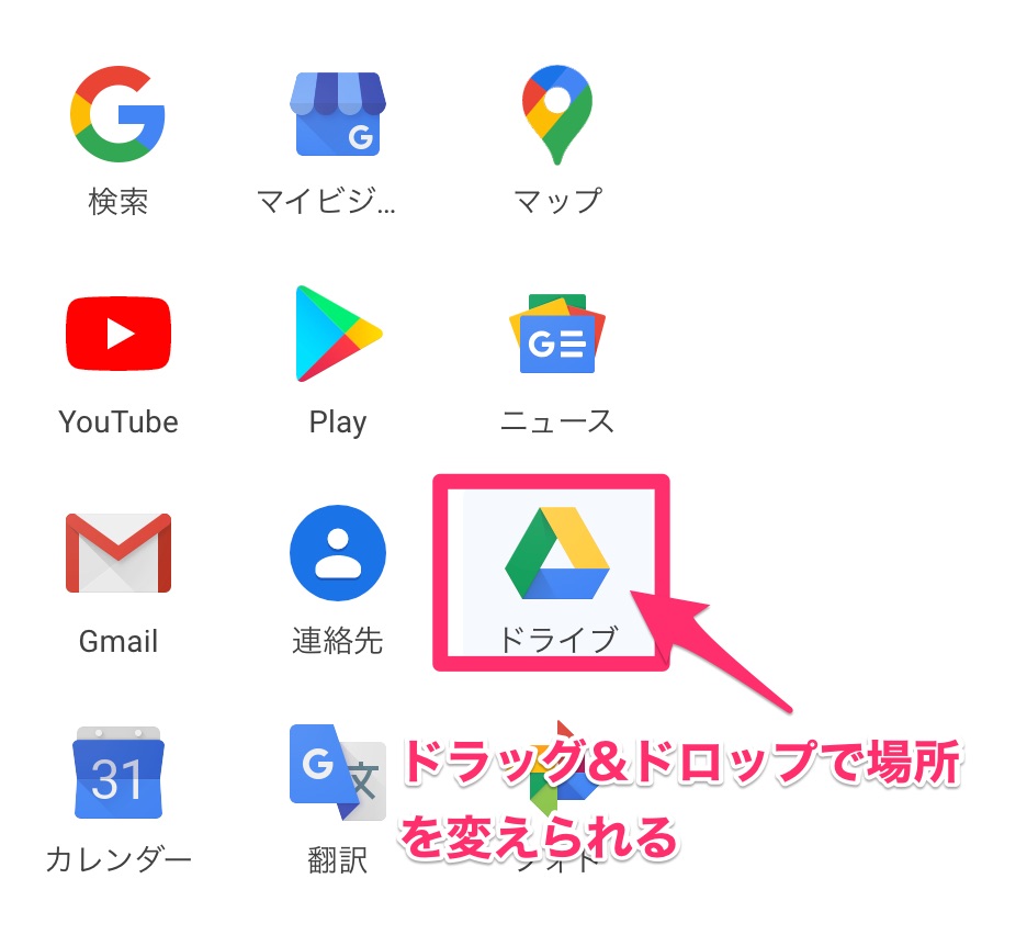 Googleアプリの配置はドラッグ&ドロップで移動が可能です。