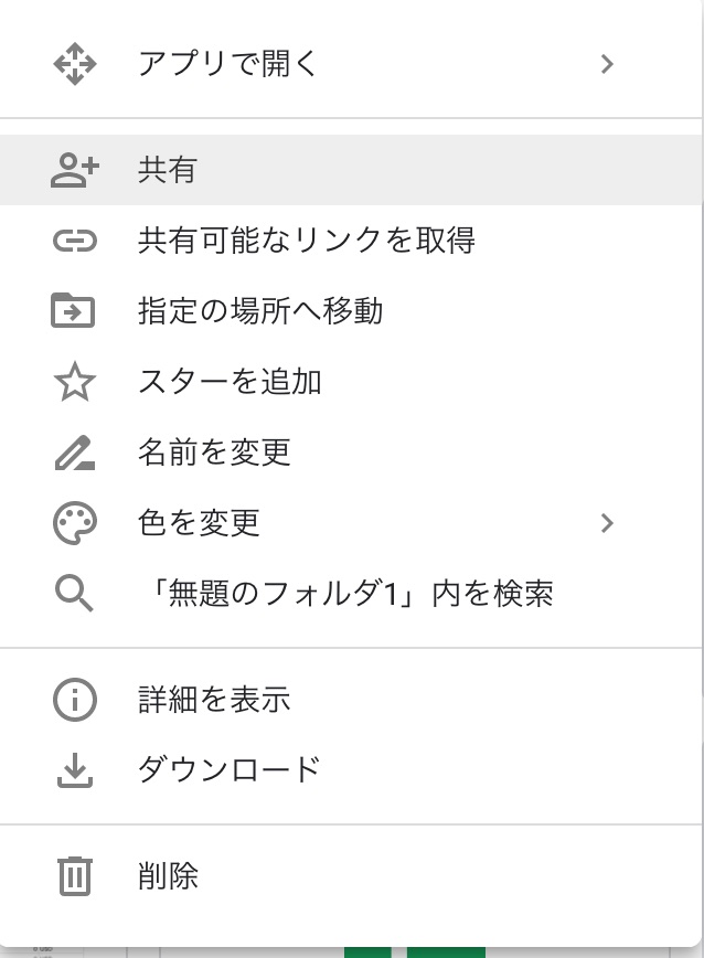 Googleドライブのフォルダやファイルの上で右クリックメニューを開くと