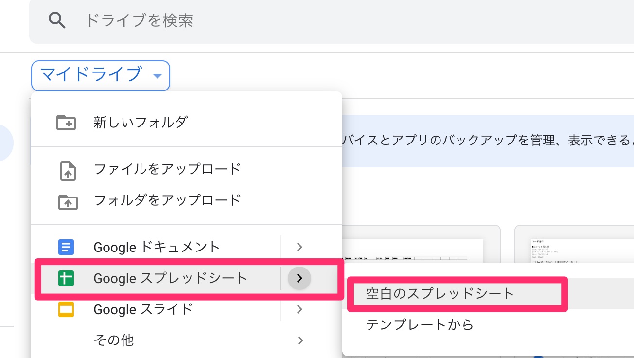 GoogleドライブからGoogleスプレッドシートを新規作成
