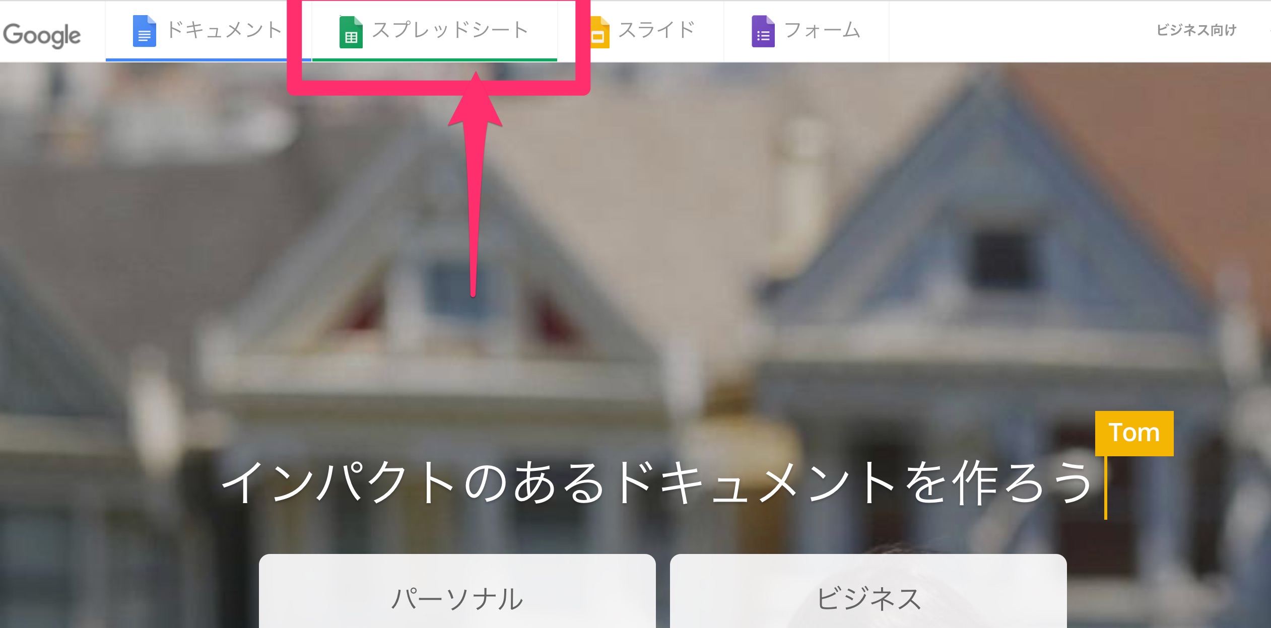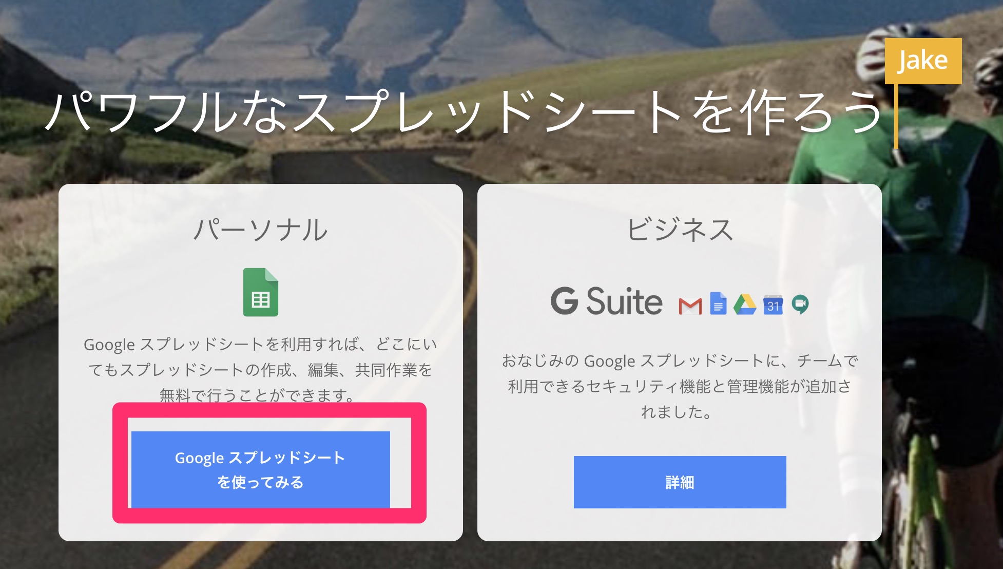 パーソナルの枠にある「Googleスプレッドシートを使ってみる」を選びます。