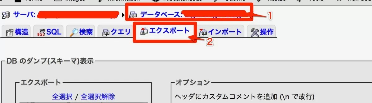2.画面上の「データベース」をクリックし、「エクスポート」をクリックします。