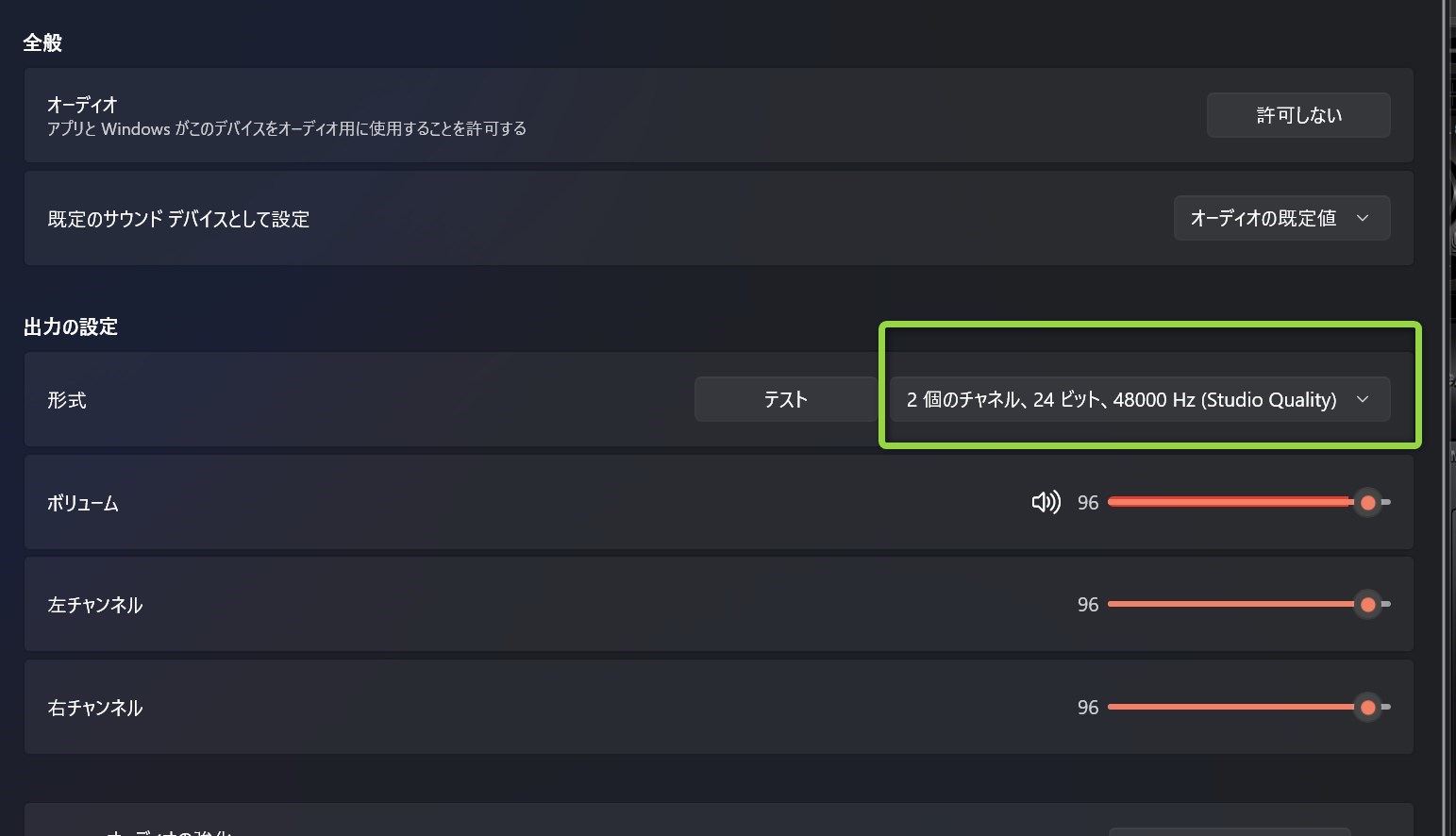 オーディオのサンプルレートとビットレートを先程メモした値に設定します。